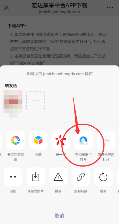 1. 如果您是通过微信或其他工具扫码进入的该页,请点击右上角的菜单按钮,找到“在浏览器中打开”。然后再点击下方按钮进行下载